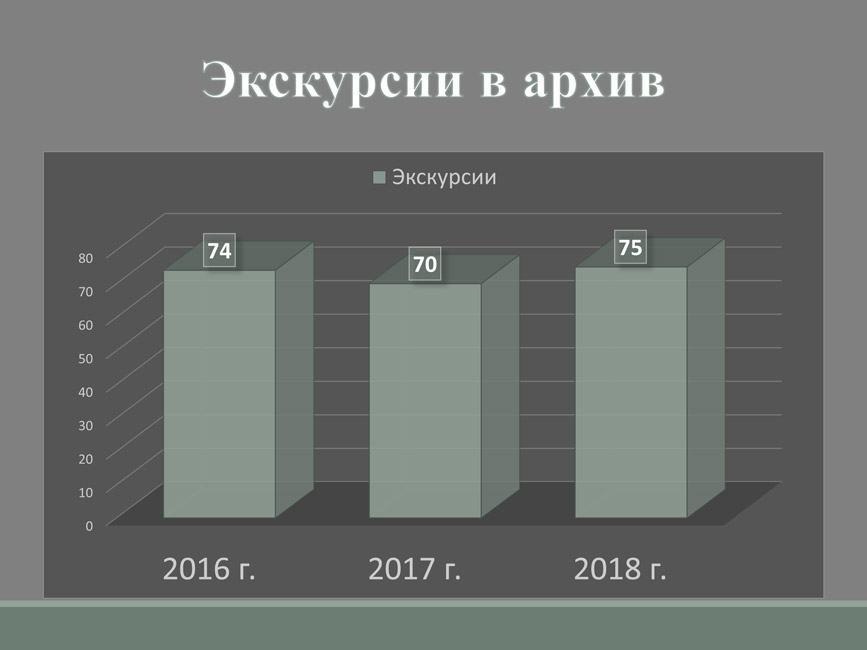Принято 75 экскурсий в архив с демонстрацией тематических киновидеопрограмм. Количество экскурсантов составило 1702 чел. (слайд 40).
