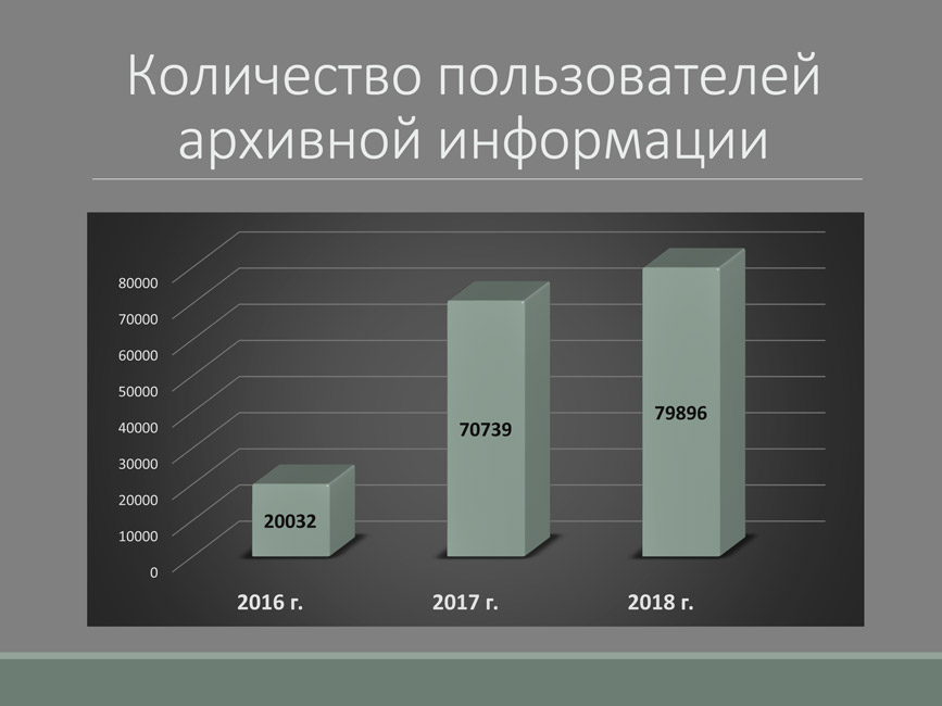 Специалисты архива ведут постоянную работу по популяризации документов, хранящихся в фонде архива. За прошедший год с коллекцией архива познакомились почти 80 тысяч человек (слайд 41).