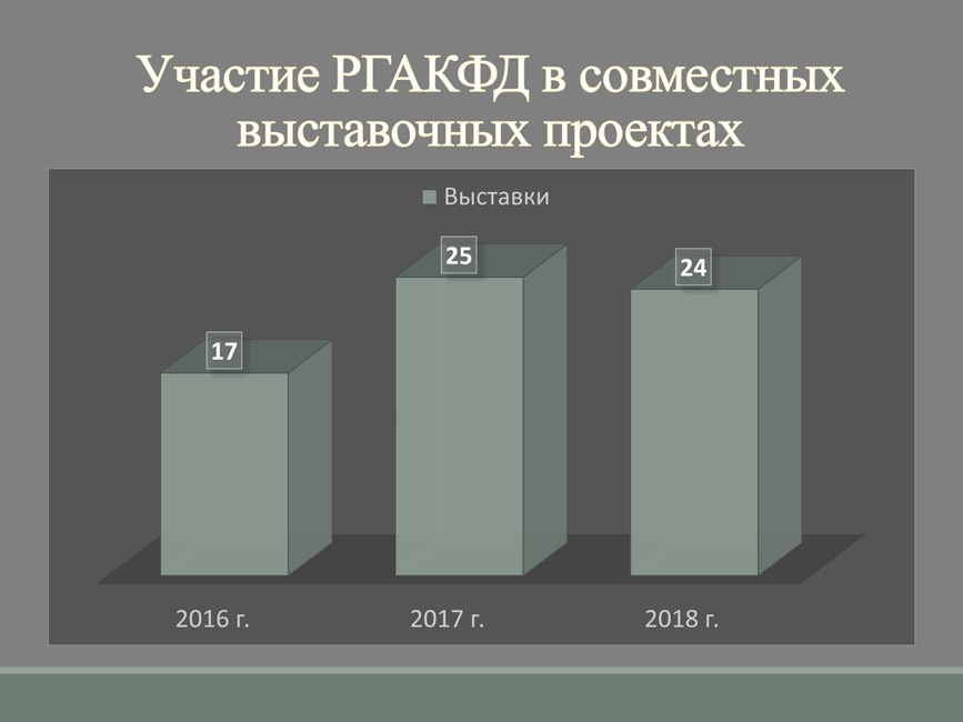 Архив принял участие в подготовке 9 совместных архивных и межотраслевых документальных выставках, 15 совместных партнерских выставочных проектов (слайд 42). Это совместные проекты с РГГУ (слайд 43), Минобороны России, музеем-заповедником Коломенское, Ярославским историко-архитектурным и художественным музеем, РОСФОТО (слайд 44), госпиталем им. Вишневского, администрацией г. Красногорска и другие (слайд 45). Отношения со многими партнерами продолжатся и в этом году.