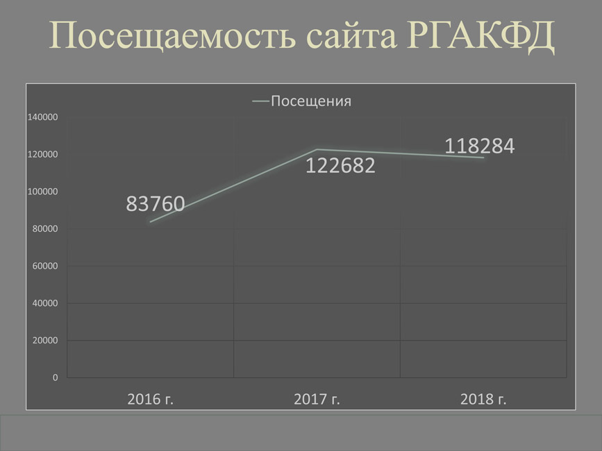 Наш архивный web-сайт постоянно обновлялся и пополнялся. За год зарегистрировано более 118 тысяч посещений сайта и более 17 тысяч посещений страницы РГАКФД на портале «Архивы России» (слайд 49).