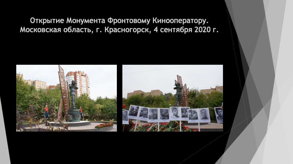И память о создателях этих бесценных кинодокументов не забыта. В сентябре 2020 года состоялось открытие памятника Фронтовому кинооператору. Первый в мире монумент был установлен в Красногорске Российским военно-историческим обществом, при непосредственном участии нашего архива, Администрации городского округа Красногорск, Союза кинематографистов Российской Федерации.
