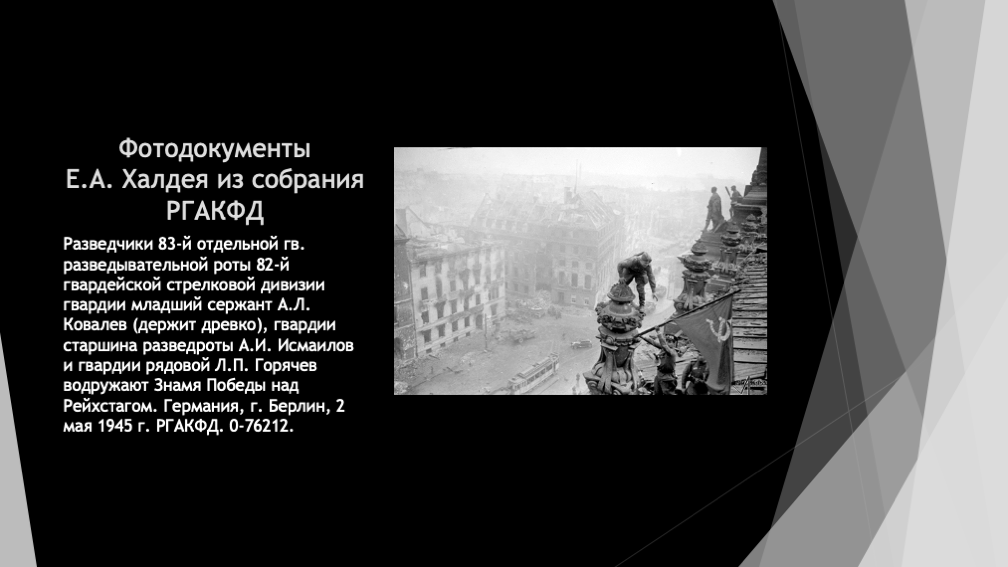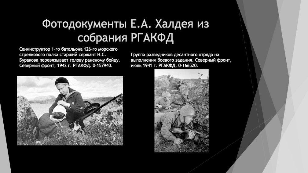 Таким образом, РГАКФД удалось собрать самый большой комплекс работ Евгения Халдея, довольно много из которых относятся к периоду Второй Мировой войны.