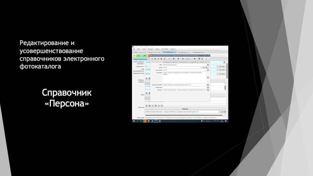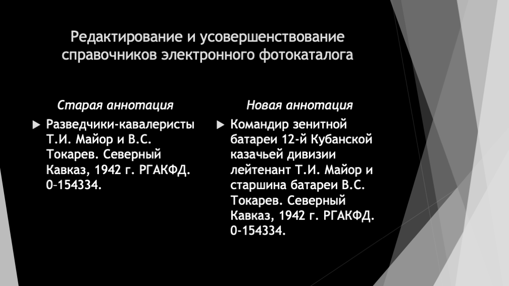 Не менее важный вид работы – редактирование и усовершенствование справочников электронного фотокаталога, потому что фотодокументы периода Второй Мировой войны заносились в электронный каталог в то время, когда не были доступны сайты Министерства обороны.