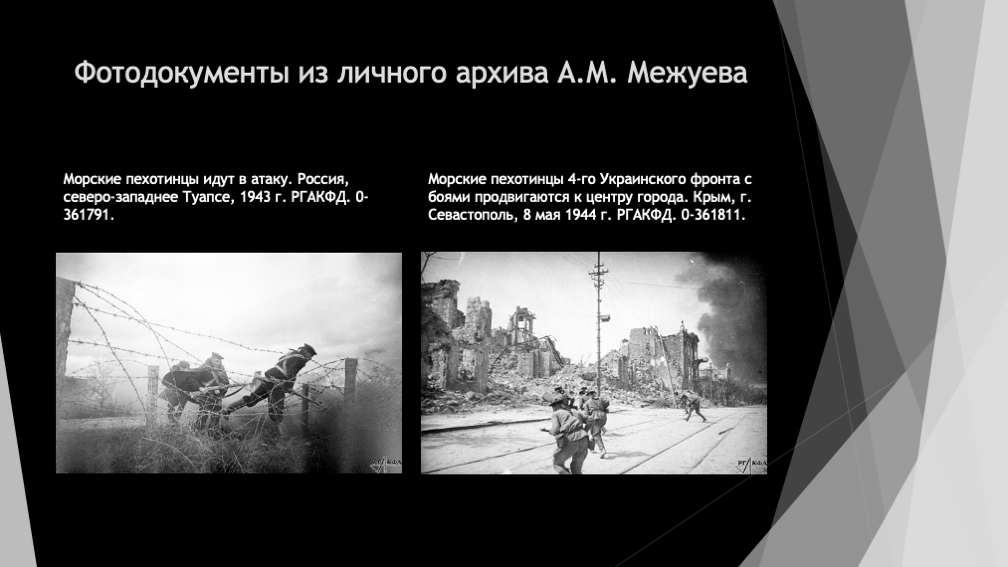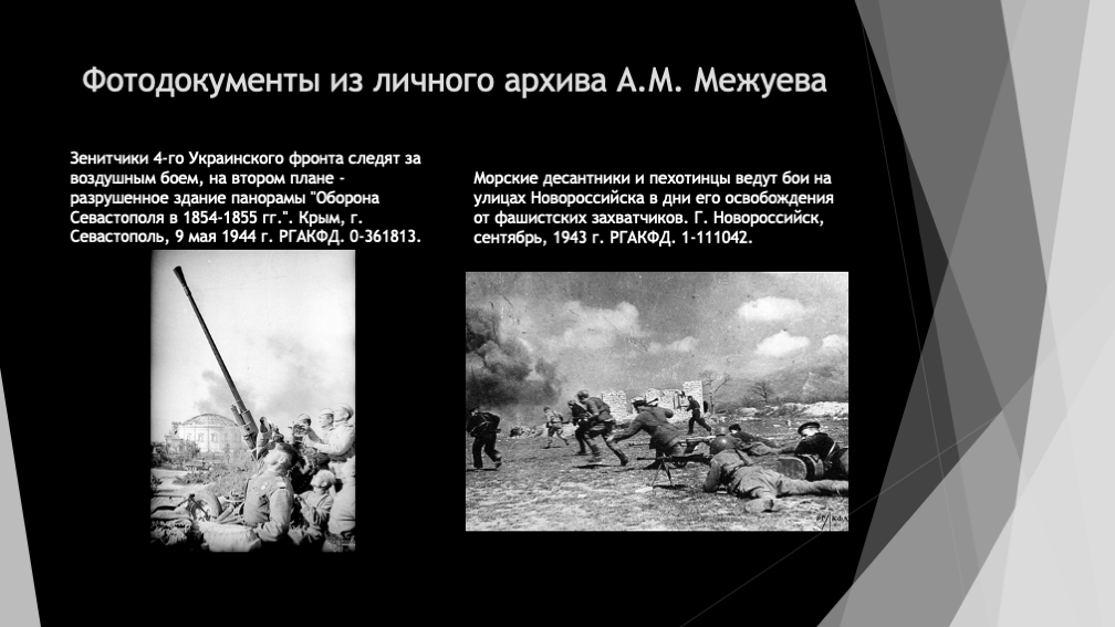 С 2018 года в РГАКФД ведется работа по ретроконверсии фотодокументов - это процесс преобразования информации, перевод документов из одной формы в другую; в данном случае – перевод каталога в карточной форме в электронный, с выверкой и уточнением информации и проверкой соответствия фотоизображения. В 2019 году была проведена работа по ретроконверсии 357-ми фотодокументов Алексея Межуева, принятых на хранение еще в 1999 году, и относящихся к периоду Великой Отечественной войны.