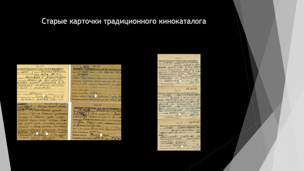На этих примерах вы видите этапы работы с традиционным кинокаталогом. В ходе которой было изъято более 2000 дублетных карточек.