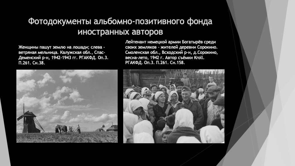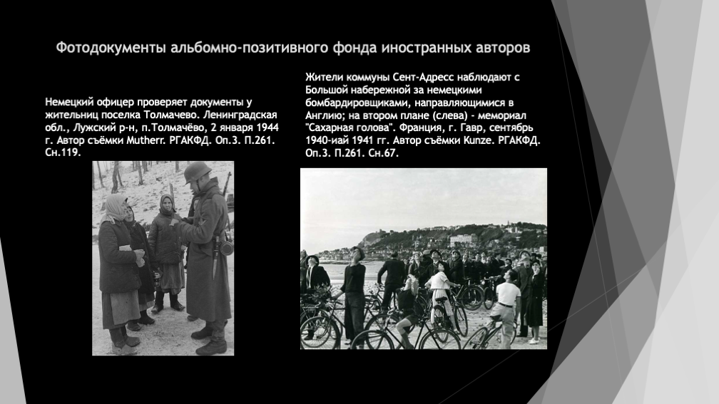 Нельзя не упомянуть и о находящемся в нашем архиве альбомно-позитивном фонде иностранных авторов, который также относится к периоду Второй Мировой войны, но захватывает и предвоенный период. Эти документы менее растиражированы, потому что только незначительная часть представлена в традиционном фотокаталоге и опубликована на уже упомянутом сайте «Победа».