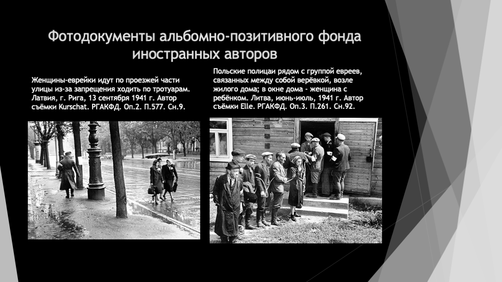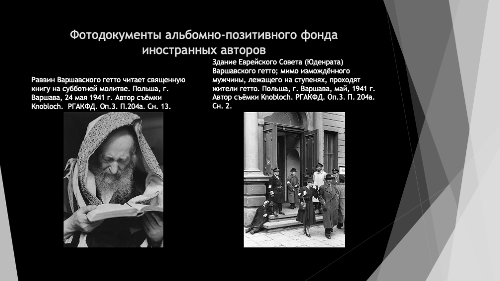 Отдельно хотелось бы выделить часть работы с фотодокументами альбомно-позитивного фонда по теме «Холокост» - преследование еврейского населения - 27 единиц хранения и непосредственно по Варшавскому гетто 29 ед.хр.