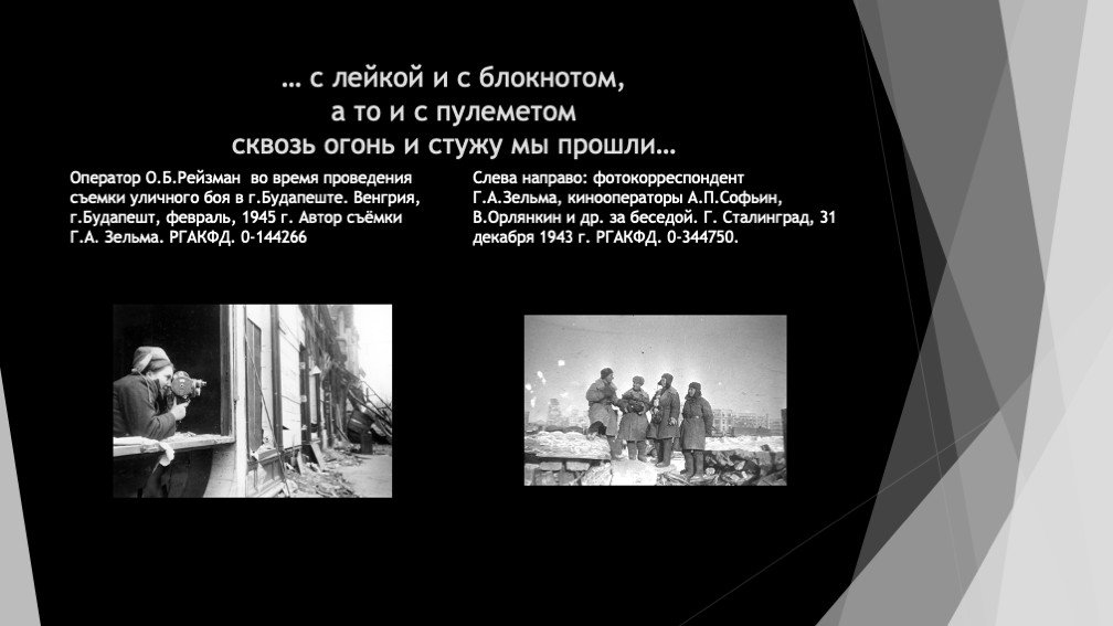 Не меньший интерес вызывают и фотодокументы РГАКФД периода Второй Мировой войны. Большая часть документов, к счастью, уже занесена в электронный фотокаталог архива и доступна пользователям архивной информации в Интернете. Это более 90 тыс. ед.хр., созданных отечественными мэтрами фотографии, в их числе Л.Б. Капустянский, Ольга Ландер, Н.И. Мицкевич, А. Становой, Г.Н. Грановский, Д. Бальтерманц, Г.А. Зельма, Я.И. Рюмкин, В.И. Орлянкин, В.А. Тёмин, М.А. Трахман, Б.Е. Вдовенко, В.С. Тарасевич.
