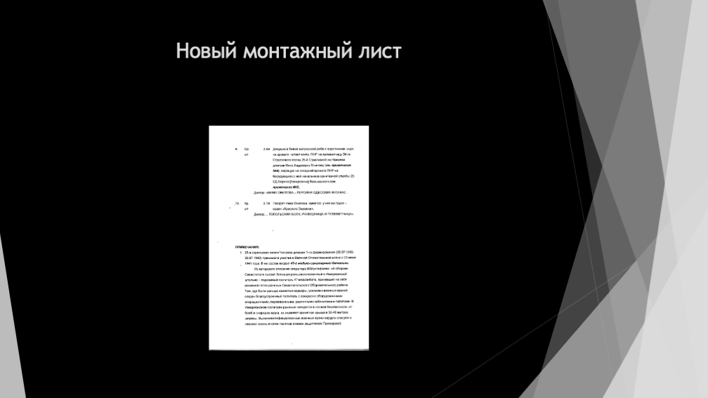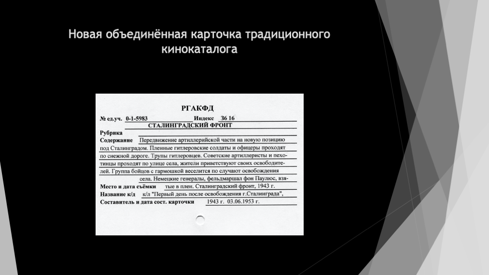 Таким образом, наиболее точная информация оказалась в рукописных карточках традиционного каталога, в авторских описаниях кинооператоров и старых монтажных листах, которые, значительно пополненные за последние годы, находились в хранилище дублей монтажных листов. Электронный кинокаталог и монтажные листы, доступные пользователям в читальном зале, не отвечали современным поисковым требованиям.