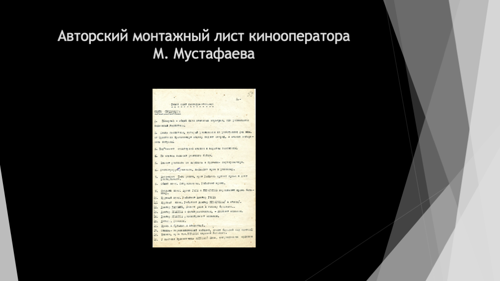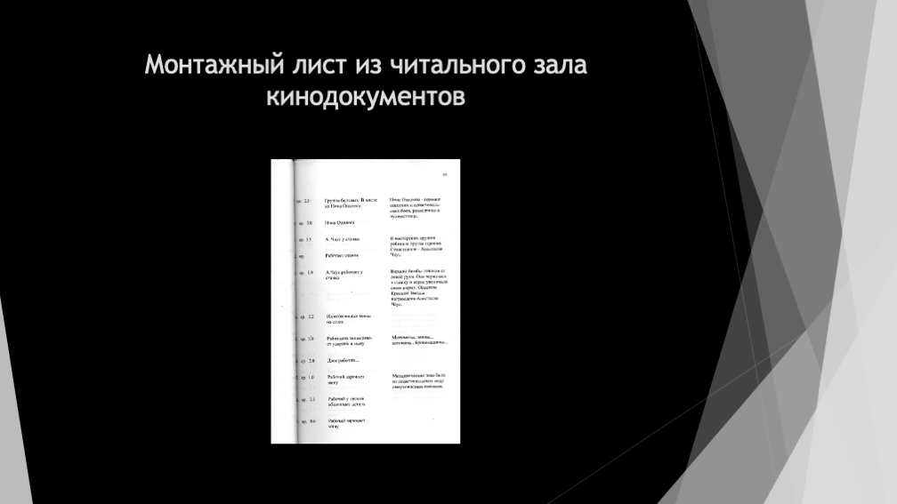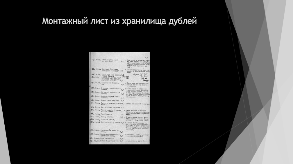 Во всех остальных видеодокументах используется компиляция наших кинодокументов. Со студий поступают монтажные листы в которых хроника или не описана, или описана совершенно безграмотно. Этой проблеме посвящено не одно выступление специалистов архива.
