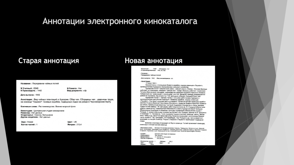 Старый и новый вариант аннотации в электронном кинокаталоге. В перспективе к аннотациям будут привязаны изображения и монтажные листы.