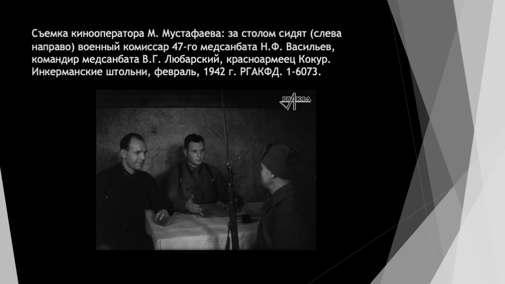 Это стоп-кадр одного из кинодокументов. Мы видим молодых и полных сил – 40-летнего батальонного комиссара, военного комиссара 47-го медсанбата 25-й стрелковой имени Чапаева дивизии Николая Федоровича Васильева и 25-летнего военврача 2-го ранга, командира 47-го медсанбата Виктора Григорьевича Любарского. Спиной к нам красноармеец Кокур. Съемка произведена оператором Мурзой Мустафаевым в Инкерманской штольне в начале февраля 1942 года. А в начале июля 1942 года - Васильев пропал без вести в районе Херсонесского маяка, а Любарский покончил собой в районе 35-й береговой батареи, чтобы избежать плена.