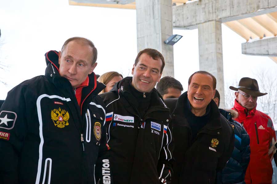 Председатель Правительства Российской Федерации В.В. Путин, Президент Российской Федерации Д.А. Медведев, экс-глава правительства Италии Сильвио Берлускони, президент Международной федерации бобслея и скелетона Иво Ферриани (слева направо) и другие в день проведения тестовых заездов на санно-бобслейной трассе «Санки». Российская Федерация, Краснодарский край, г. Сочи. 09.03.2012 г.