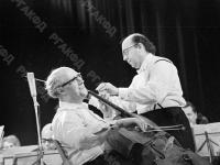 0-393876-ч/б Виолончелист М.Л.Ростропович в сопровождении Большого симфонического оркестра Всесоюзного радио и Центрального телевидения под руководством главного дирижера Г.Н.Рождественского во время репетиции на сцене Московской консерватории имени П.И.Чайковского. СССР, г.Москва. 1970-1974гг. Фот. А.Н.Агеев.