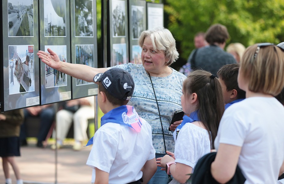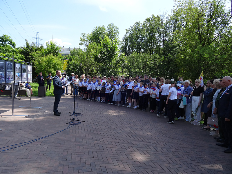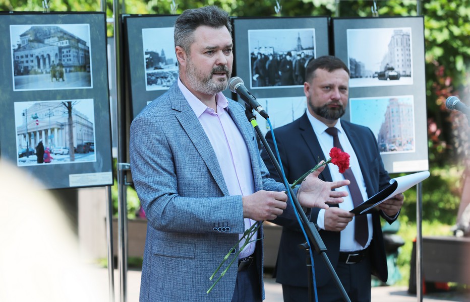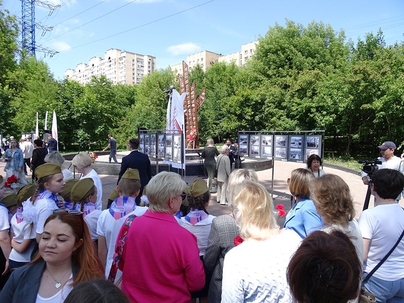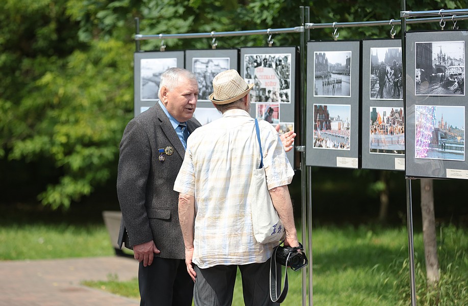 Возле памятника была развернута фотовыставка «Два мгновения – один взгляд. Москва в кинокадрах фронтовых кинооператоров и Москва современная». Экскурсии по выставке для присутствующих провели родственники фронтовых кинооператоров и представители ООО «Кинохроника» – одного из организаторов выставочного проекта.
