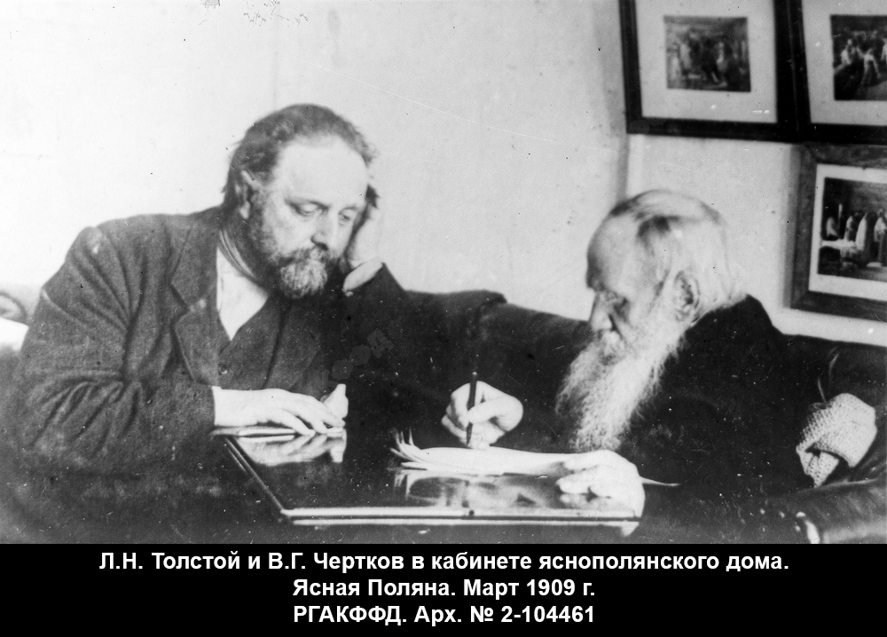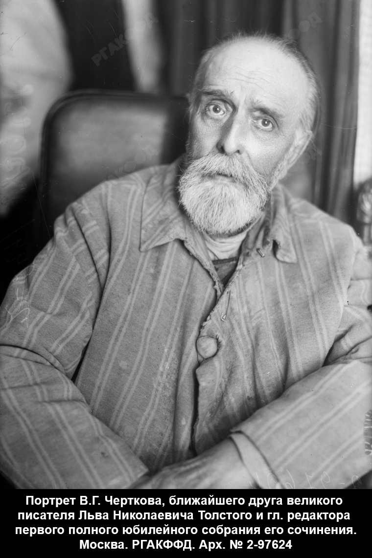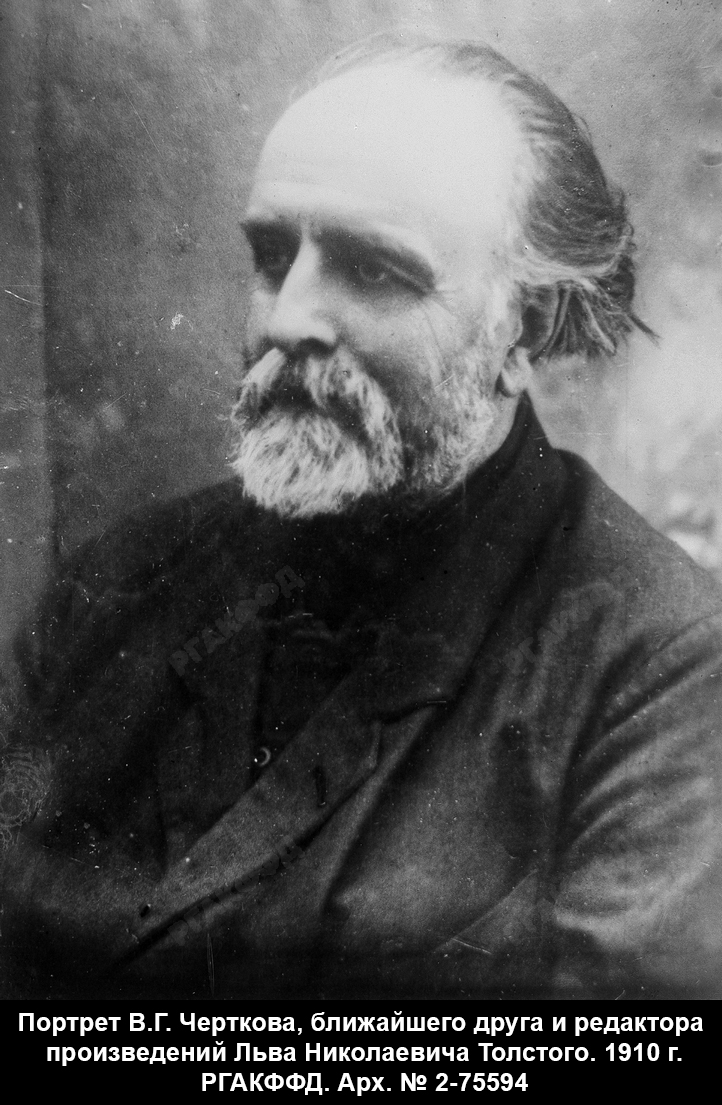Лев Толстой выразил однажды своё отношение к Владимиру Черткову такими словами: «Бог дал мне высшее счастье, – он дал мне такого друга, как Чертков». Родился Владимир Григорьевич Чертков 3 ноября (по старому стилю 22 октября) 1854 года в Санкт-Петербурге в аристократической семье, состоявшей в близком родстве со Строгановыми и Шуваловыми. Получил домашнее образование, посвятил 8 лет военной службе, после её завершения вёл просветительскую и благотворительную деятельность. В 1883 году Чертков познакомился с Толстым и духовно сблизился с ним. Выступил организатором издательства «Посредник», задачей которого стало издание и распространение за доступные народу средства художественных произведений, нравоучительной и детской литературы, в том числе работ самого Толстого и крупных русских писателей, творивших в конце XIX – начале XX веков. Со временем Чертков стал единственным человеком, которого Толстой принимал практически в любое время и без приглашения. Это влияло на обстановку в семье Толстого, особенно в последний период его жизни, когда развернулась скрытая борьба вокруг завещания писателя и наследования прав на его сочинения. Главным редактором полного (академического) собрания сочинений Л.Н. Толстого, издававшегося на протяжении 30 лет с 1928 года, Чертков был до конца своей жизни. Умер В.Г. Чертков 9 ноября 1936 года.