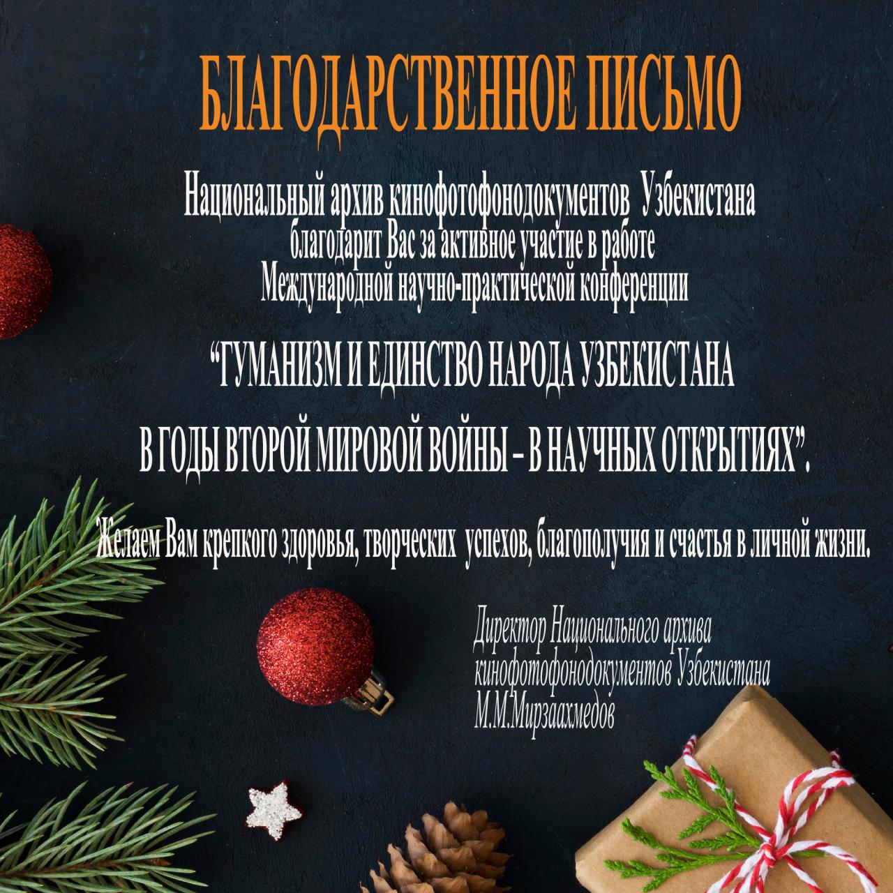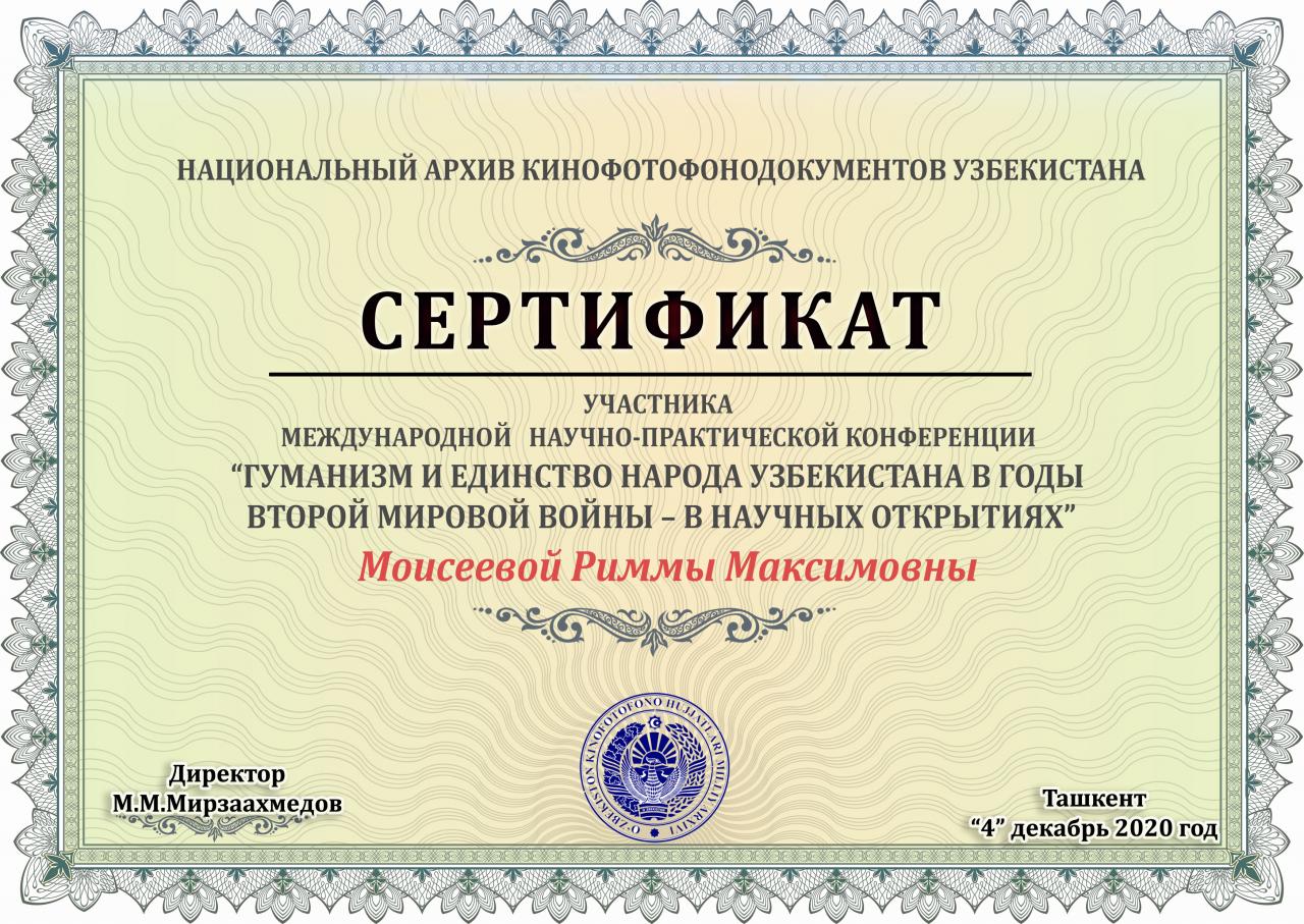4 декабря 2020 года заместитель директора РГАКФД Р.М. Моисеева приняла участие в Международной научно-практической конференции «Гуманизм и единство народа Узбекистана в годы Второй мировой войны – в научных открытиях», посвященной 28-летию принятия Конституции Республики Узбекистан.