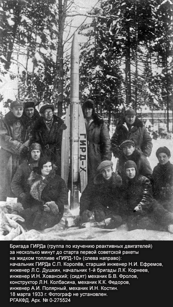 Фотообъектив запечатлел тогда ещё руководителя группы по изучению реактивных двигателей Сергея Королёва (первый слева) с товарищами и единомышленниками перед стартом ракеты в Московской области 18 марта 1933 года.