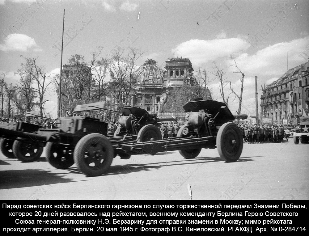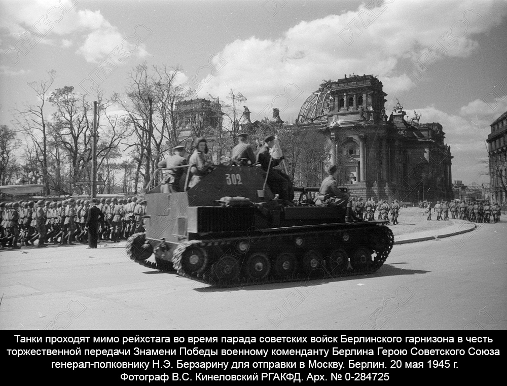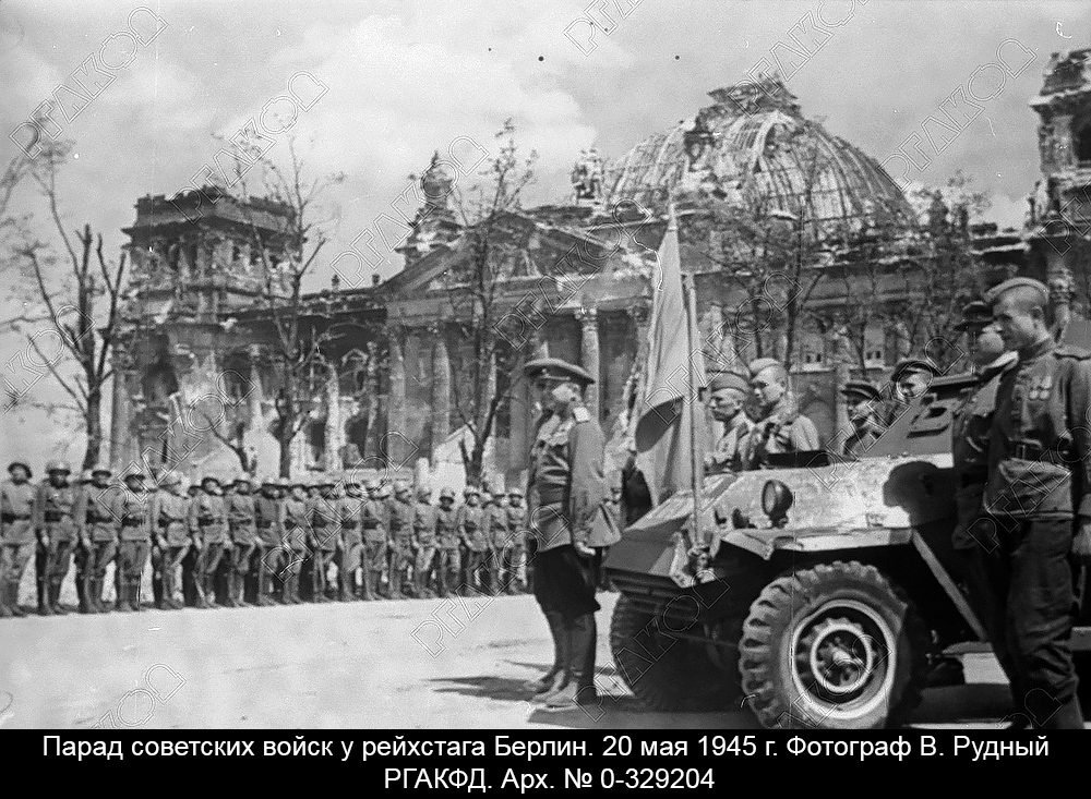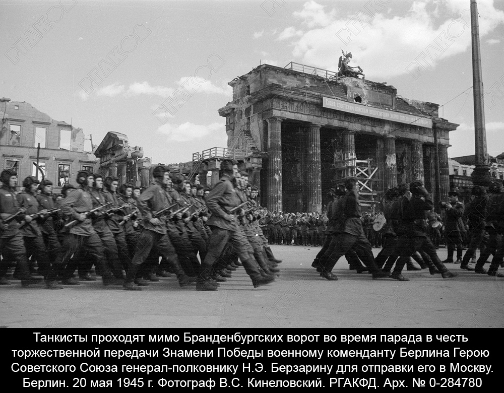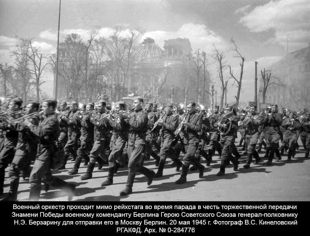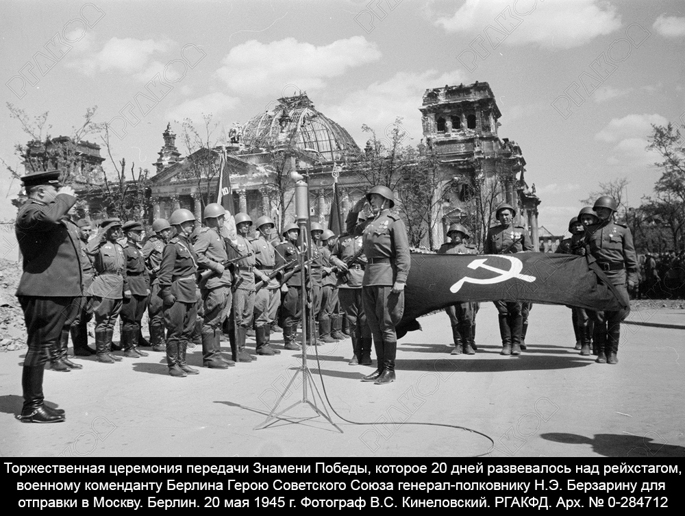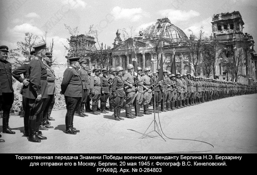 20 мая 1945 года у рейхстага состоялся военный парад, посвящённый торжественной передаче Знамени Победы военному коменданту Берлина генерал-полковнику Н.Э. Берзарину.