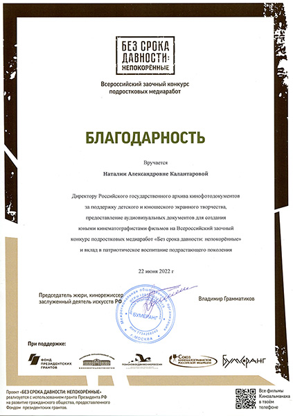 22 июня 2022 года директору РГАКФД Н.А. Калантаровой и заместителю директора Р.М. Моисеевой были вручены Благодарности Всероссийского заочного конкурса подростковых медиаработ «Без срока давности: непокоренные».