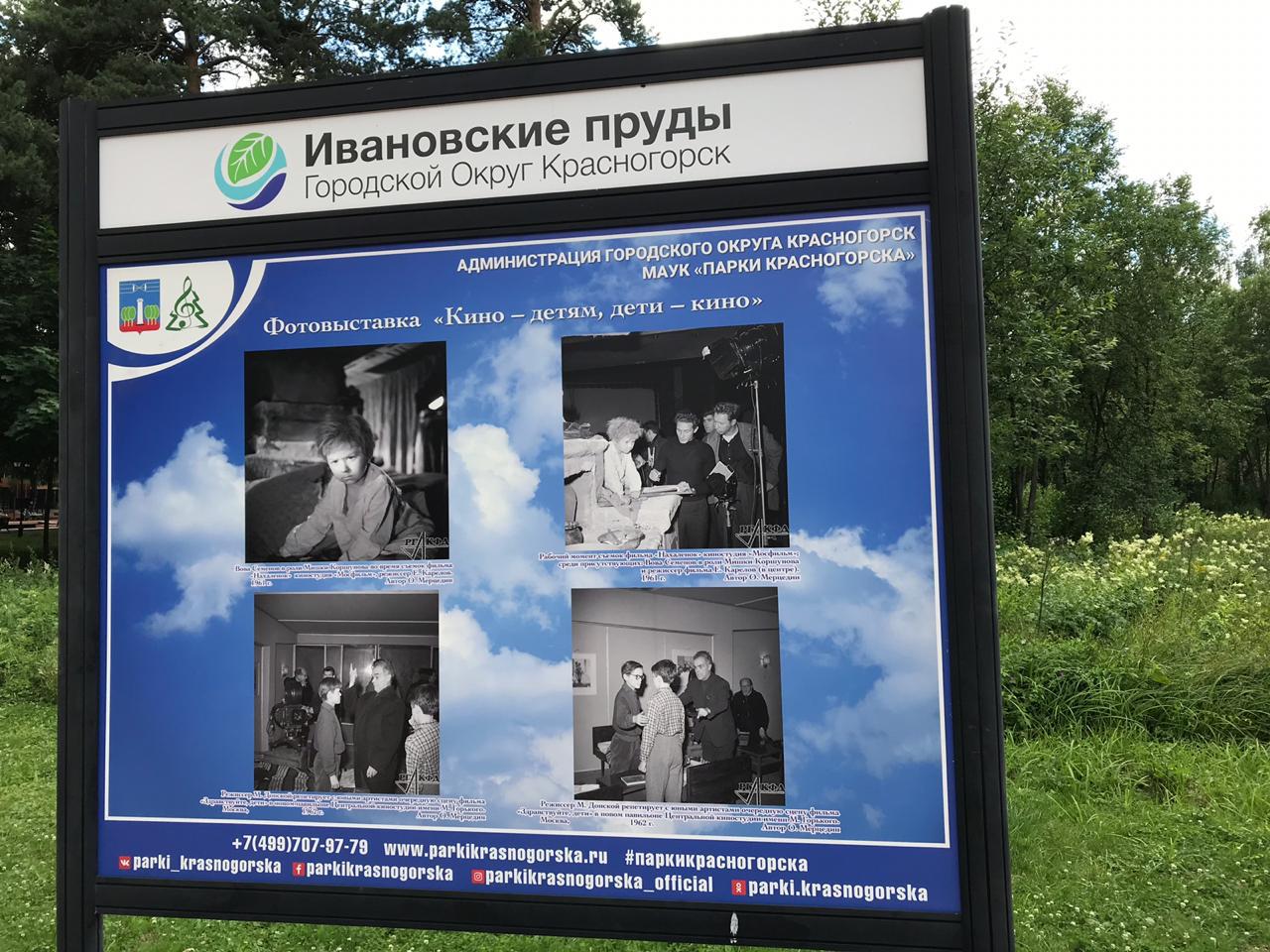23 июля 2019 г. в рамках 90-летия Московской области в Красногорском парке «Ивановские пруды» состоялось торжественное открытие фотовыставки «Кино – детям, дети – кино». МАУК «Парки Красногорска» совместно с Российским государственным архивом кинофотодокументов для всех желающих проводят выставку, где можно увидеть фотокадры съёмок фильмов прошлых лет. На них запечатлены юные артисты во время съёмочного процесса. Выставку составили более сорока фотографий из фонда Российского государственного архива кинофотодокументов.