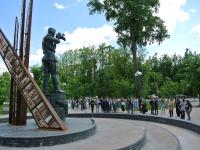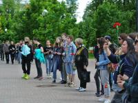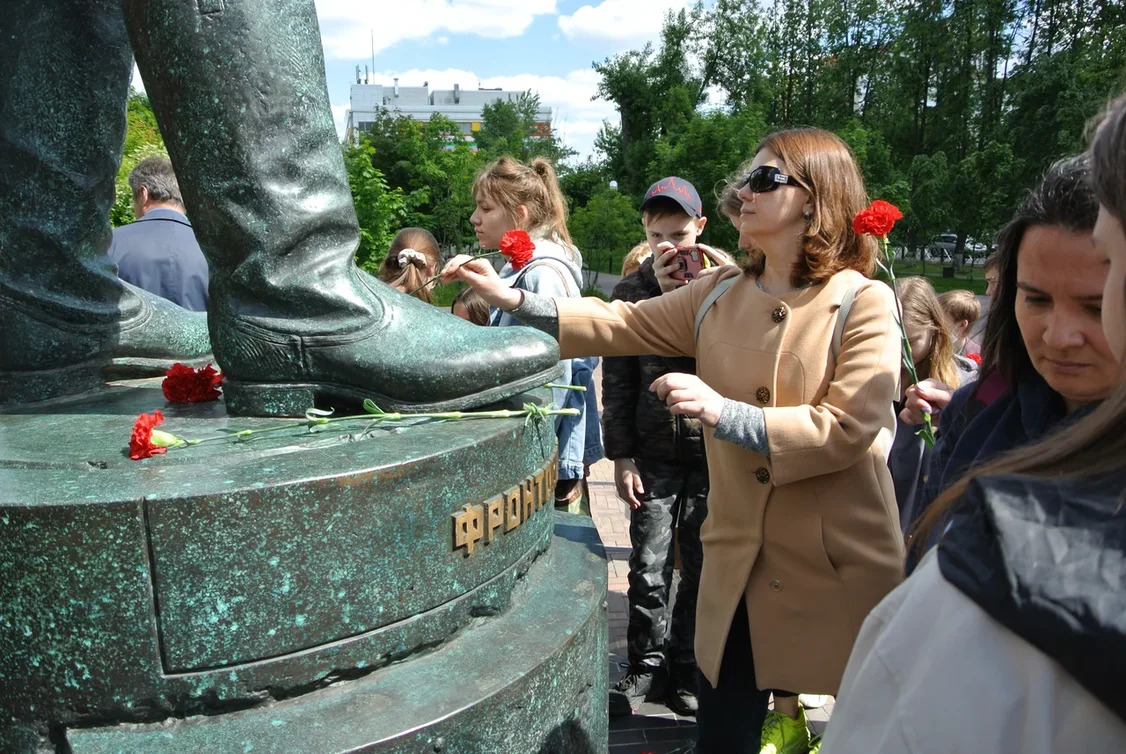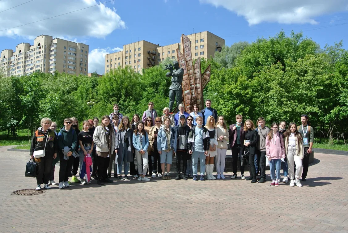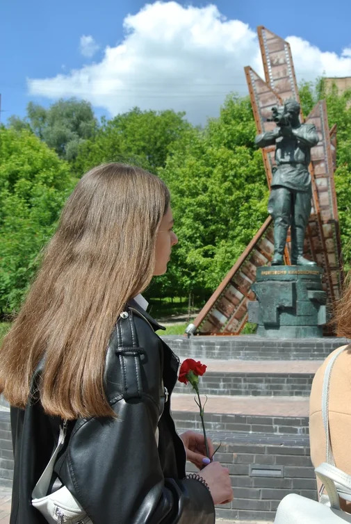 Затем юные кинематографисты в сопровождении сотрудников РГАКФД возложили цветы к Памятнику фронтовому кинооператору в Яблоневом сквере и почтили память фронтовых кинооператоров минутой молчания.