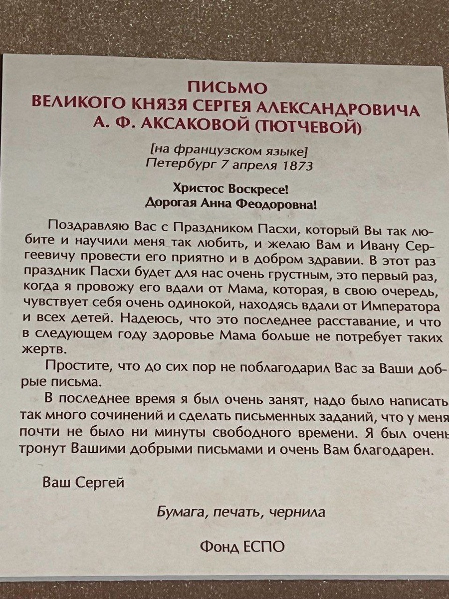В дар Елисаветинско-Сергиевскому просветительскому обществу в день начала работы выставки переданы подлинные предметы интерьера одного из флигелей усадьбы Ильинское, расположенной ныне на территории городского округа Красногорск Московской области. Усадьбой продолжительное время владели и проживали в ней в летние месяцы Сергей Александрович и Елизавета Фёдоровна.