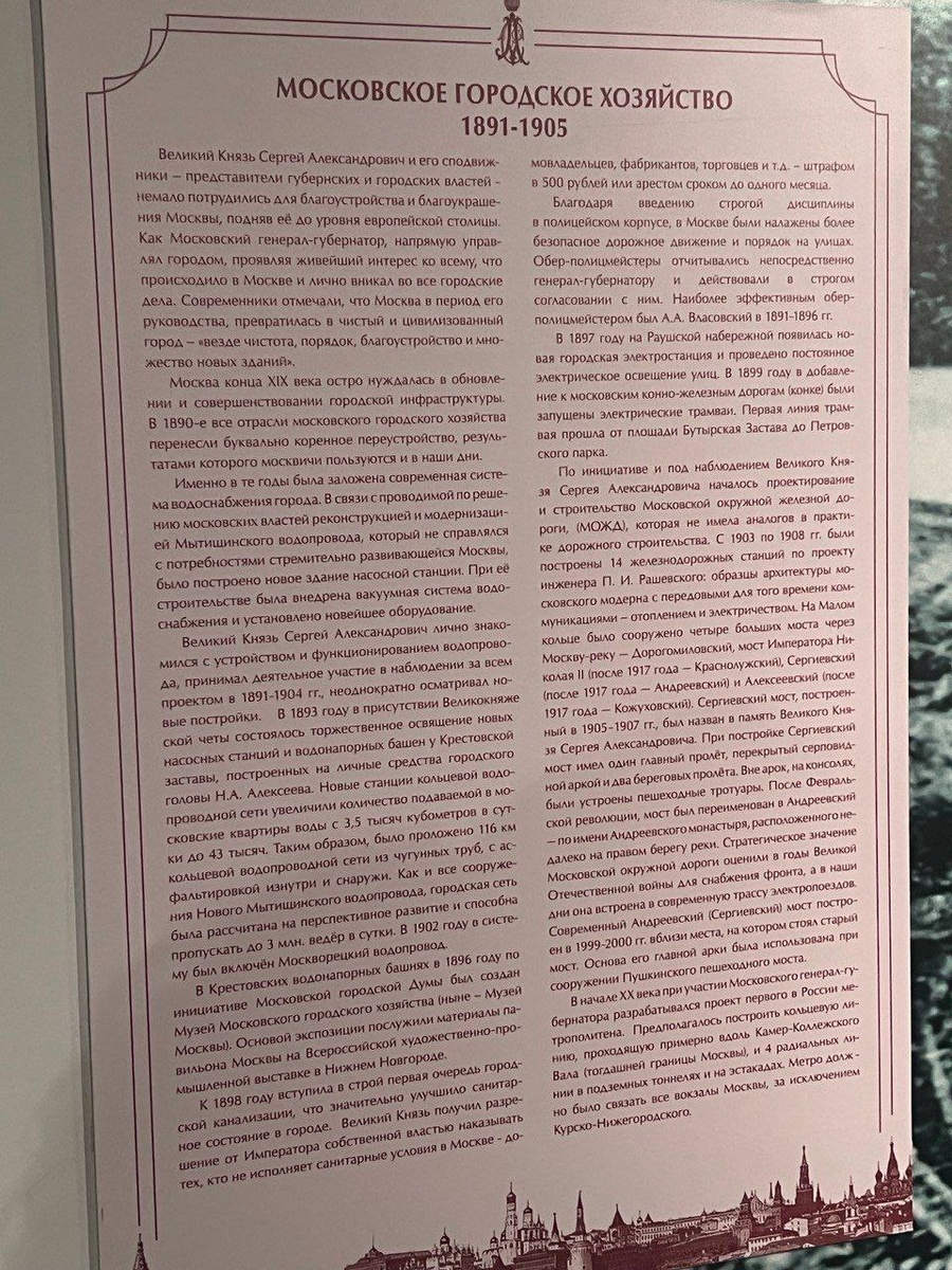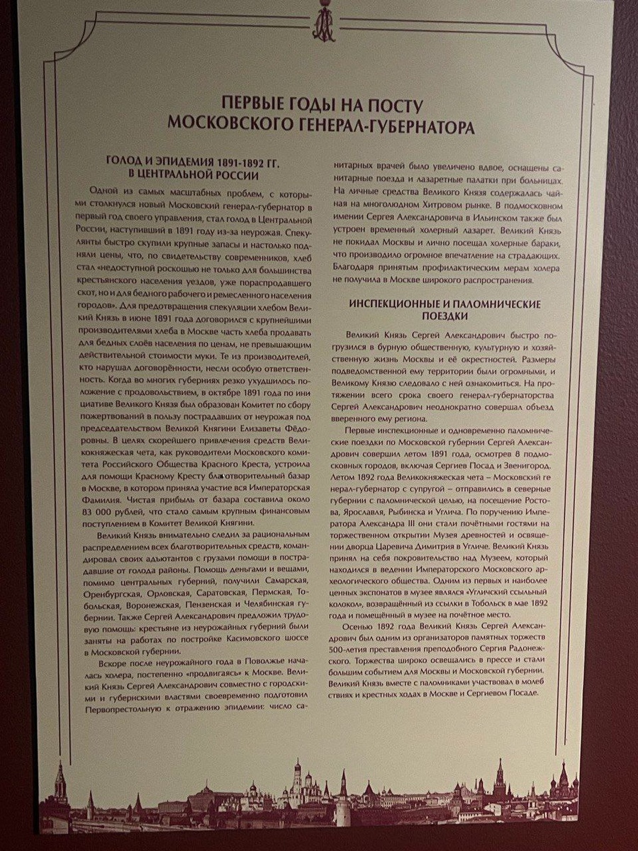 Выставка подробно освещает труды Великого князя Сергея Александровича как государственного деятеля, военачальника, просветителя, мецената, в период губернаторства которого в общественной, культурной, духовной жизни, в городском хозяйстве, транспортной сети, архитектурном облике древней столицы совершились крупные преобразования.