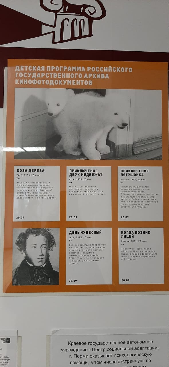 К нынешнему фестивалю представители РГАКФД подготовили и представили две кинопрограммы для школьников разных возрастов: картины о животных для младших учеников («Приключения двух медвежат», режиссёр И.В. Венжер, ЦСДФ, 1959 г.; «Коза Дереза», режиссер Е. Таравкова, «Центрнаучфильм», 1985 г.; «Приключения лягушонка» режиссер И. Раев, «Леннаучфильм», 1997 г.) и программу, посвященную 220-летию со дня рождения А.С. Пушкина («День чудесный», режиссер А.Хржановский, «Союзмультфильм», 1973 г.; «Когда возник лицей…», режиссер К. Артюхов, ООО «Кинор», 2011 г.).
