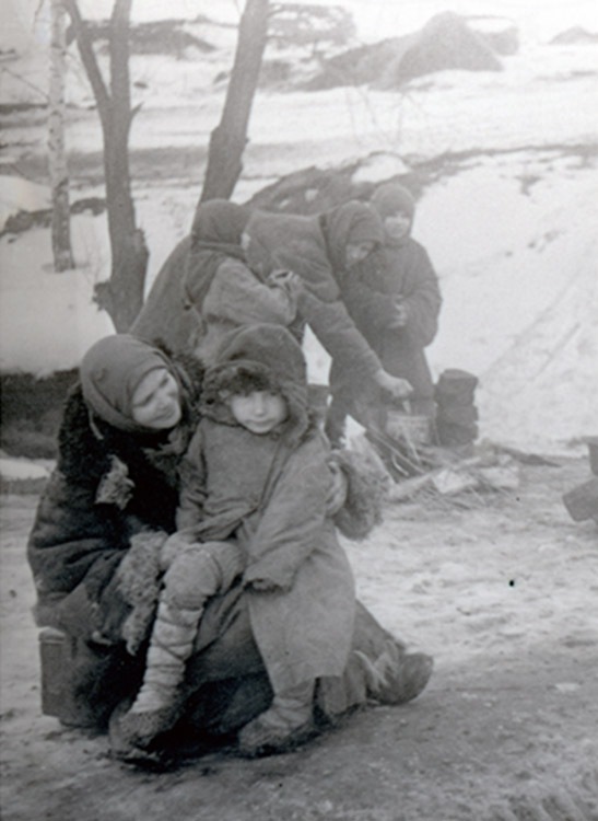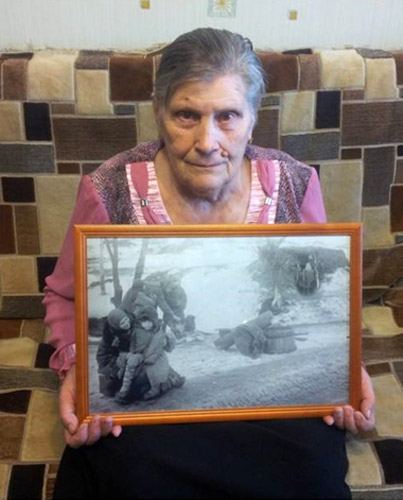 Варвару Мешкову из Краснинского района Смоленской области немцы выгнали из дома с 5-ю детьми на мороз, заняв ее дом. Мать с детьми два года жили в холодной темной землянке до прихода Красной армии осенью 1943 года. Все дети остались живы. Дождались с фронта отца. В Ногинском районе найдена девочка с фотографии (на фото сзади справа, стоит рядом с матерью) Зинаида Дмитриевна. Фотография передана в семью при личной встрече: