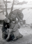 Политрук взвода пешей разведки казах Базарбаев Игибай (слева) был тяжело ранен через несколько месяцев после фотографирования. Потеряв ногу вернулся в родное село. Стал председателем колхоза. Вывел его в миллионники. Установил памятник односельчанам, не вернувшимся с войны. Воспитал 7 детей. Любимый и уважаемый на родине народный герой. Фото передано детям Базарбаева Игибая в г. Алма-Ата местными журналистами: