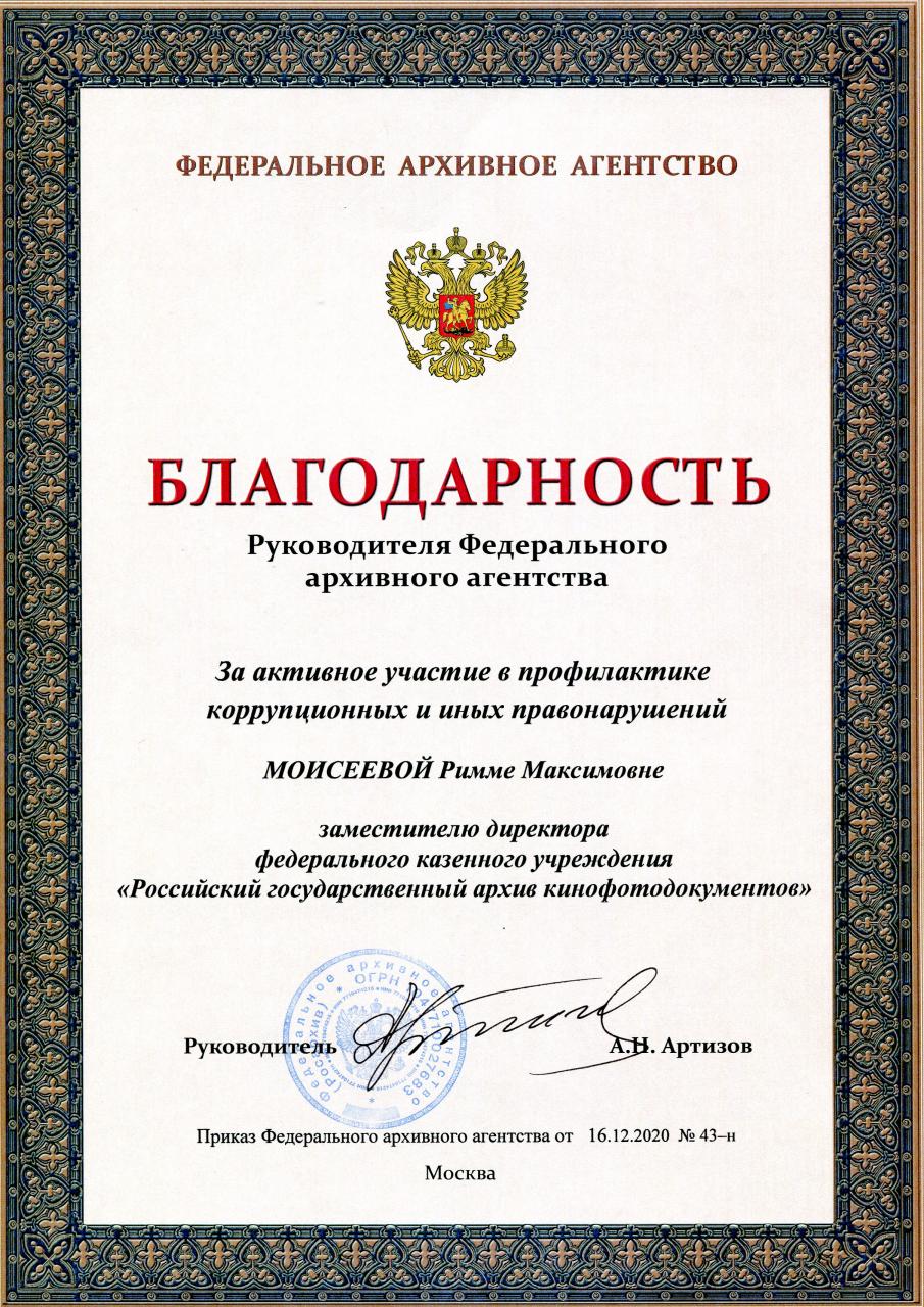 - Приказом Федерального архивного агентства от 16.12.2020 № 43-н заместителю директора Российского государственного архива кинофотодокументов, ответственной за работу по профилактике коррупционных правонарушений в архиве, Р.М. Моисеевой объявлена Благодарность «За активное участие в профилактике коррупционных и иных правонарушений». Таким образом была отмечена эффективная и плодотворная деятельность Р.М. Моисеевой на посту председателя комиссии по противодействию коррупции РГАКФД.