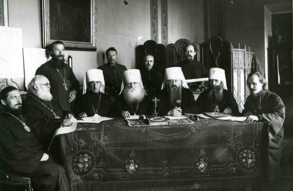 На четвертой фотографии (арх. № 2-8478), имеющее прямое отношение к лжесобору, хотелось бы остановиться отдельно. Перед нами группа священнослужителей, сидящие в центре – в епископском облачении. На каталожной карточке было указано, что это «заседание высшего духовного органа – Синода». Опять же, рукой И.В. Князьковой было подписано: «обновленческого Синода; среди присутствующих – митрополит А.Введенский». Дата при составлении карточки не была указана. Но двумя разными подчерками подписано: «начало 1920-х» и «Москва 1937». Скорее всего, что это съёмки того же 1923 года. В пользу этой даты говорят несколько фактов. Во-первых, присутствующие на фото – А.И. Введенский (сидит третий слева), Иоанн Альбинский (сидит второй слева) и Павел Красотин (сидит первый справа) выглядят совершенно так же как в вышеуказанных кинодокументах за 1922-23 годы. Во-вторых, на фотографии присутствуют два иерарха, уклонившиеся в раскол: архиепископы (в расколе митрополиты) Серафим Мещеряков (сидит второй справа) и Вениамин Муратовский (сидит четвертый справа). То, что они уже в сане митрополитов подтверждает наличие креста на их клобуках. До 1987 года только Патриарх и митрополиты имели право носить крест на головном уборе. Серафим получил титул лжемирополита в 1922 году, Вениамин Муратовский - 6 сентября 1923 года. Обновленческий Синод был создан в августе 1923 года. Известно также, что после лжесобора 1923 года иерархи разъехались по епархиям. Уже осенью 1924 года Серафим Мещеряков вышел из раскола, а в 1933 году был расстрелян. Остальных присутствующих на фотографии атрибутировать пока не удалось.